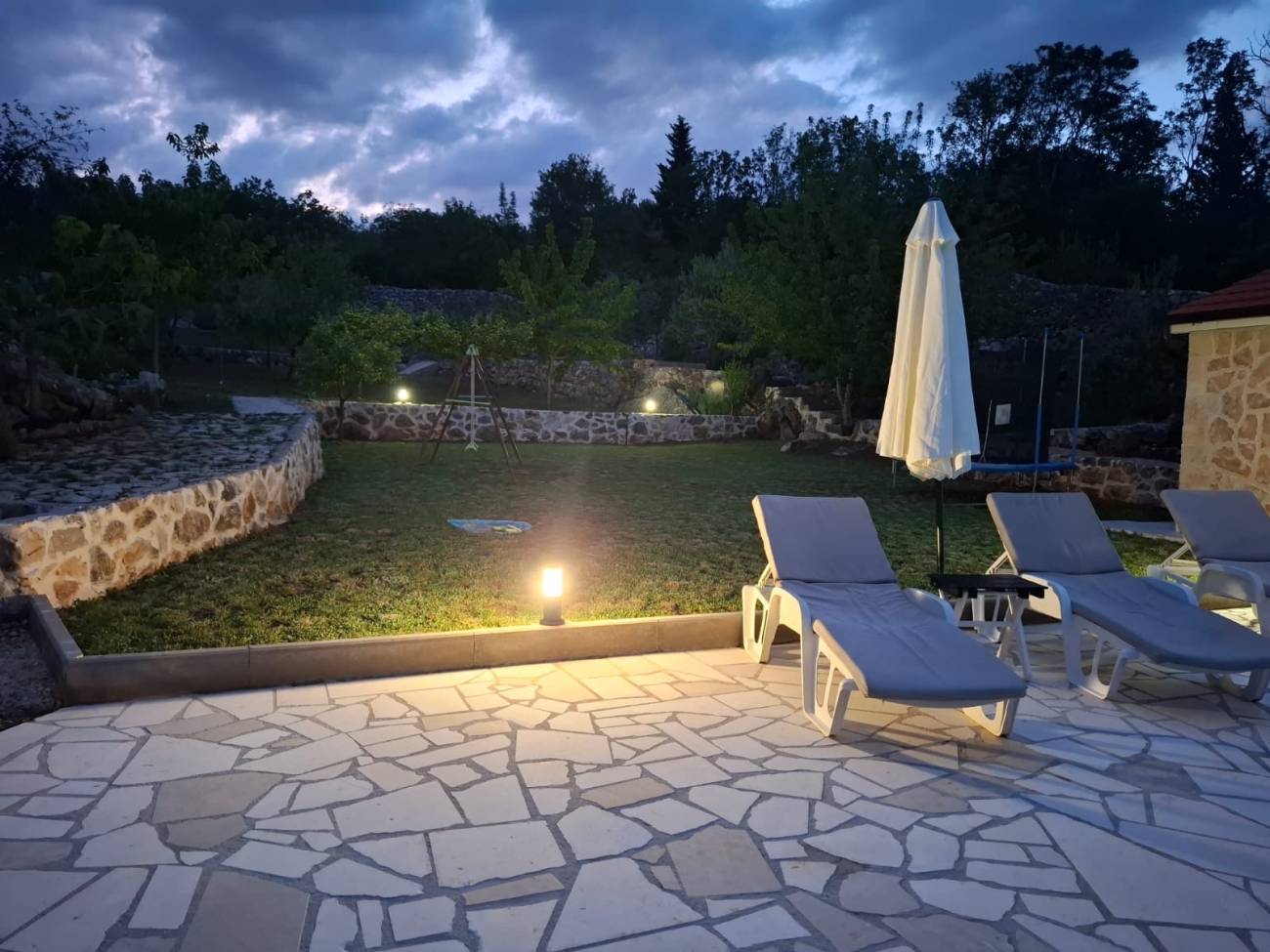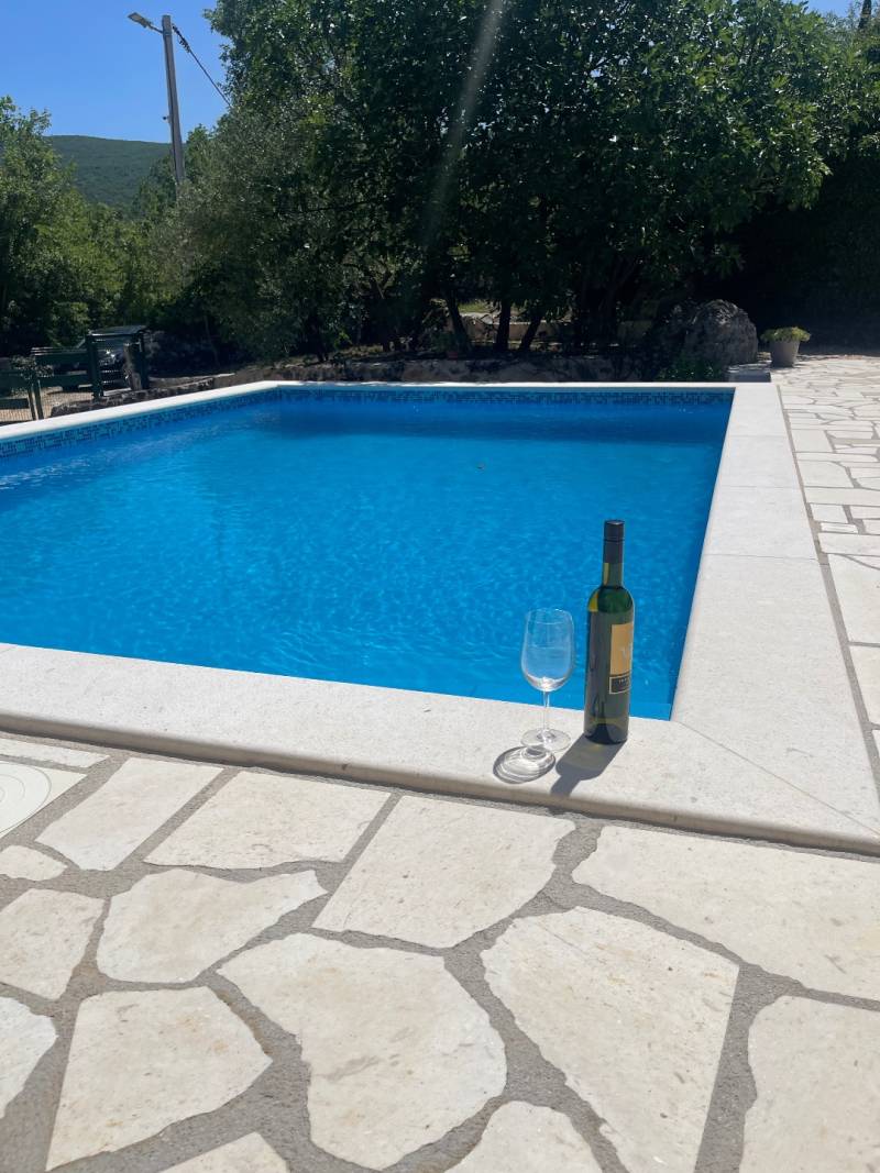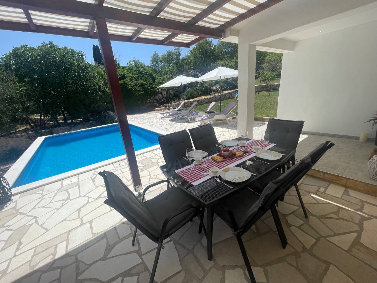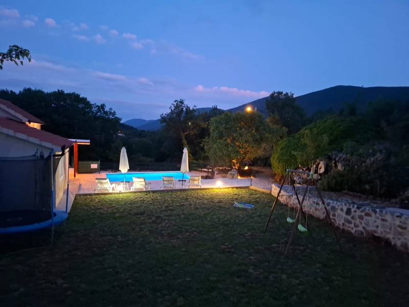 Ispred vile nalazi se veliki privatni bazen, savršen za osvježenje tijekom vrućih ljetnih dana, dok će djeca uživati na vlastitom dječjem igralištu. Prostrana natkrivena terasa s roštiljem idealna je za večernja druženja, obiteljske obroke ili romantične večere pod zvijezdama.