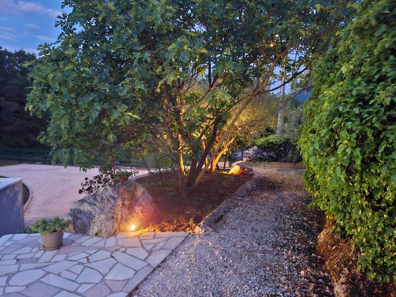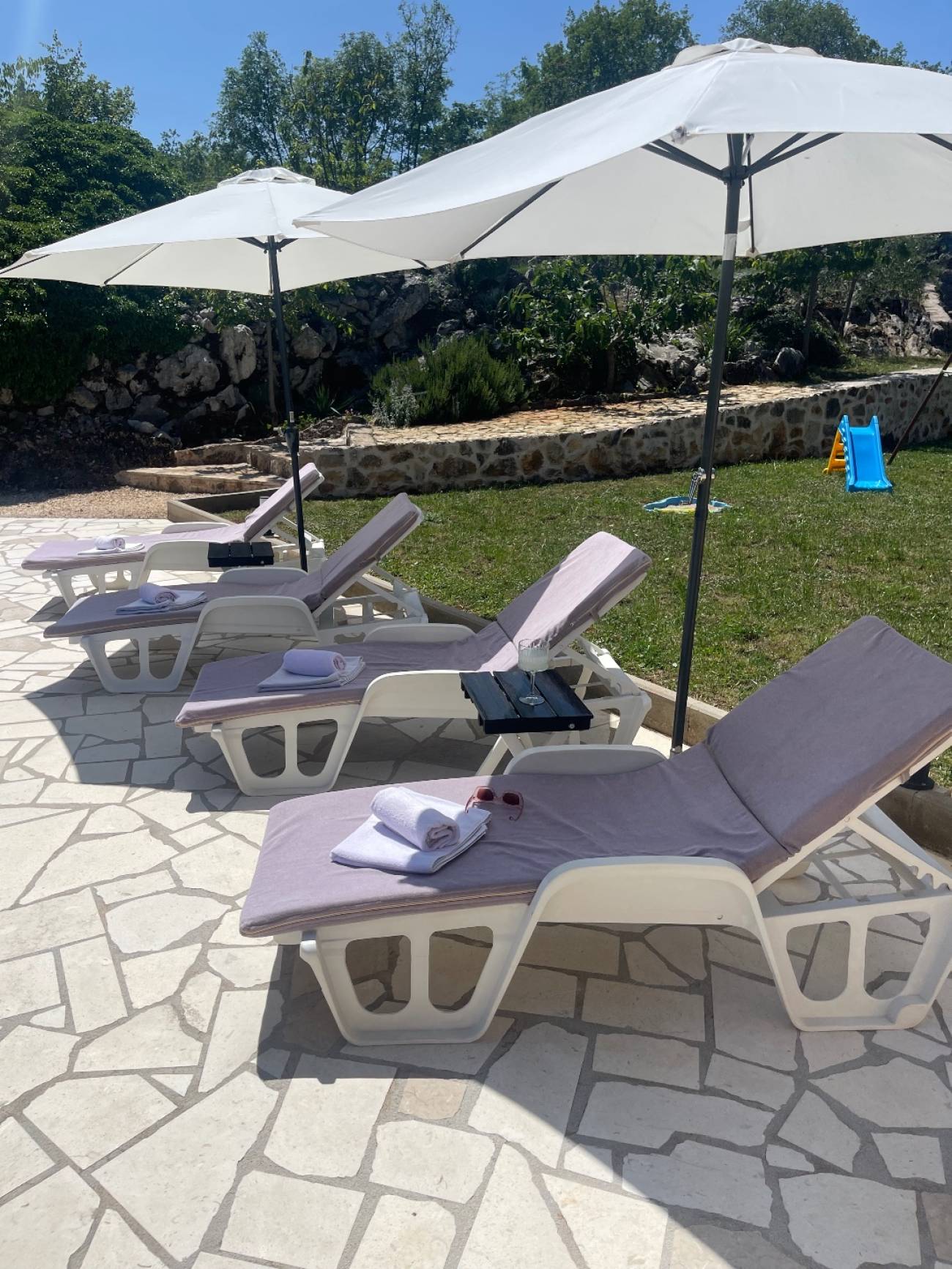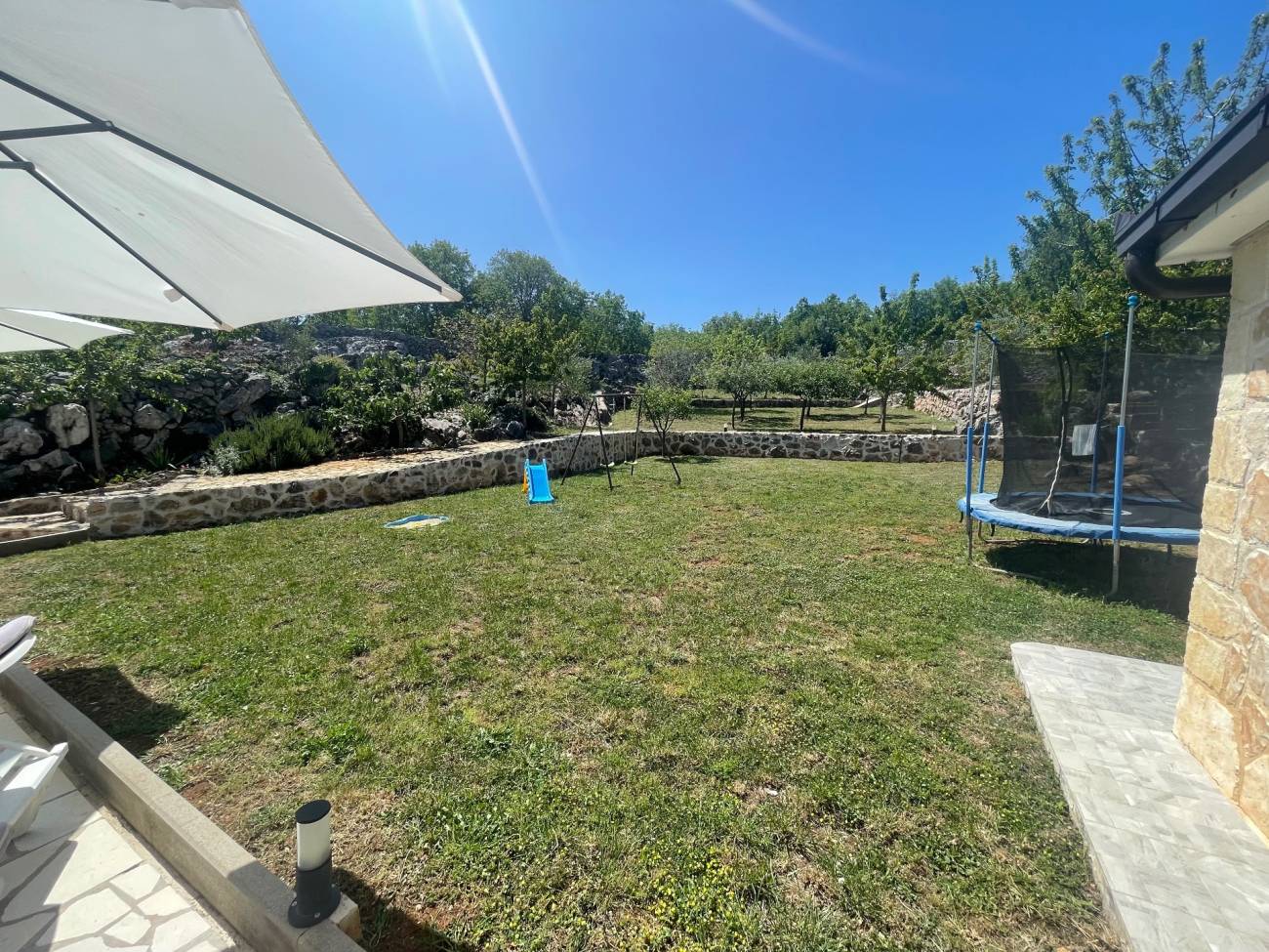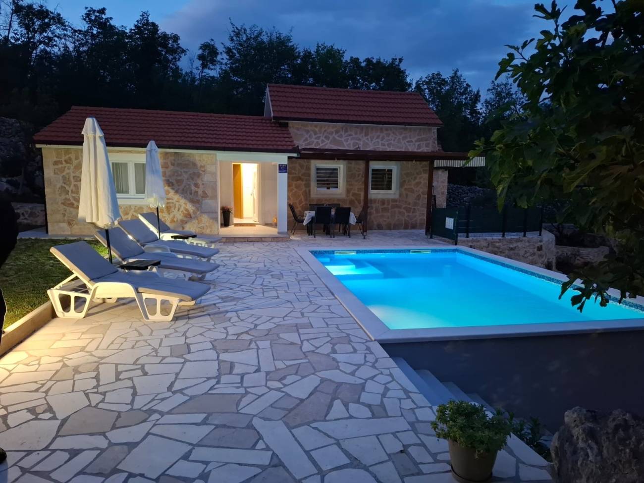 Ispred vile nalazi se veliki privatni bazen, savršen za osvježenje tijekom vrućih ljetnih dana, dok će djeca uživati na vlastitom dječjem igralištu. Prostrana natkrivena terasa s roštiljem idealna je za večernja druženja, obiteljske obroke ili romantične večere pod zvijezdama.