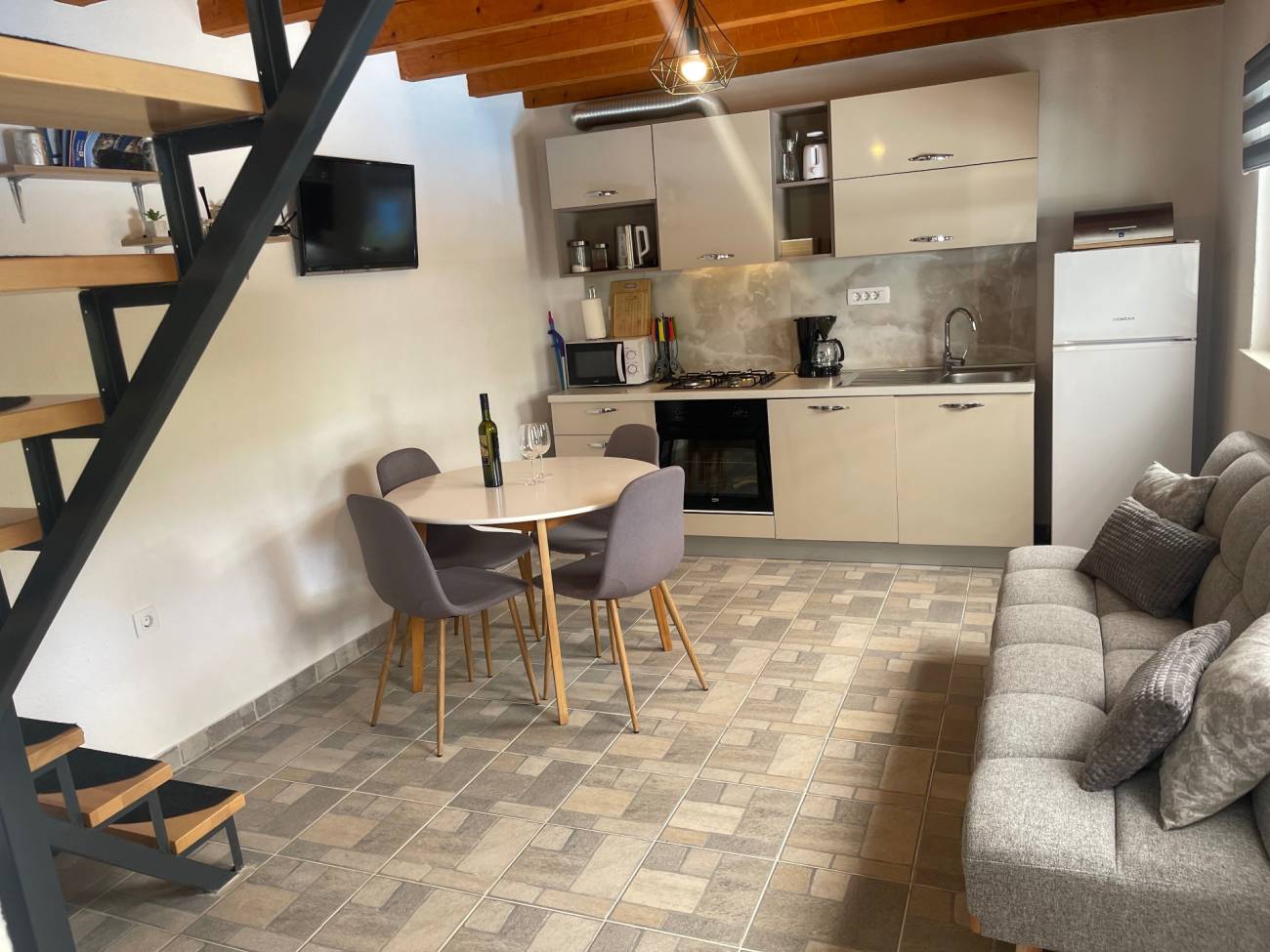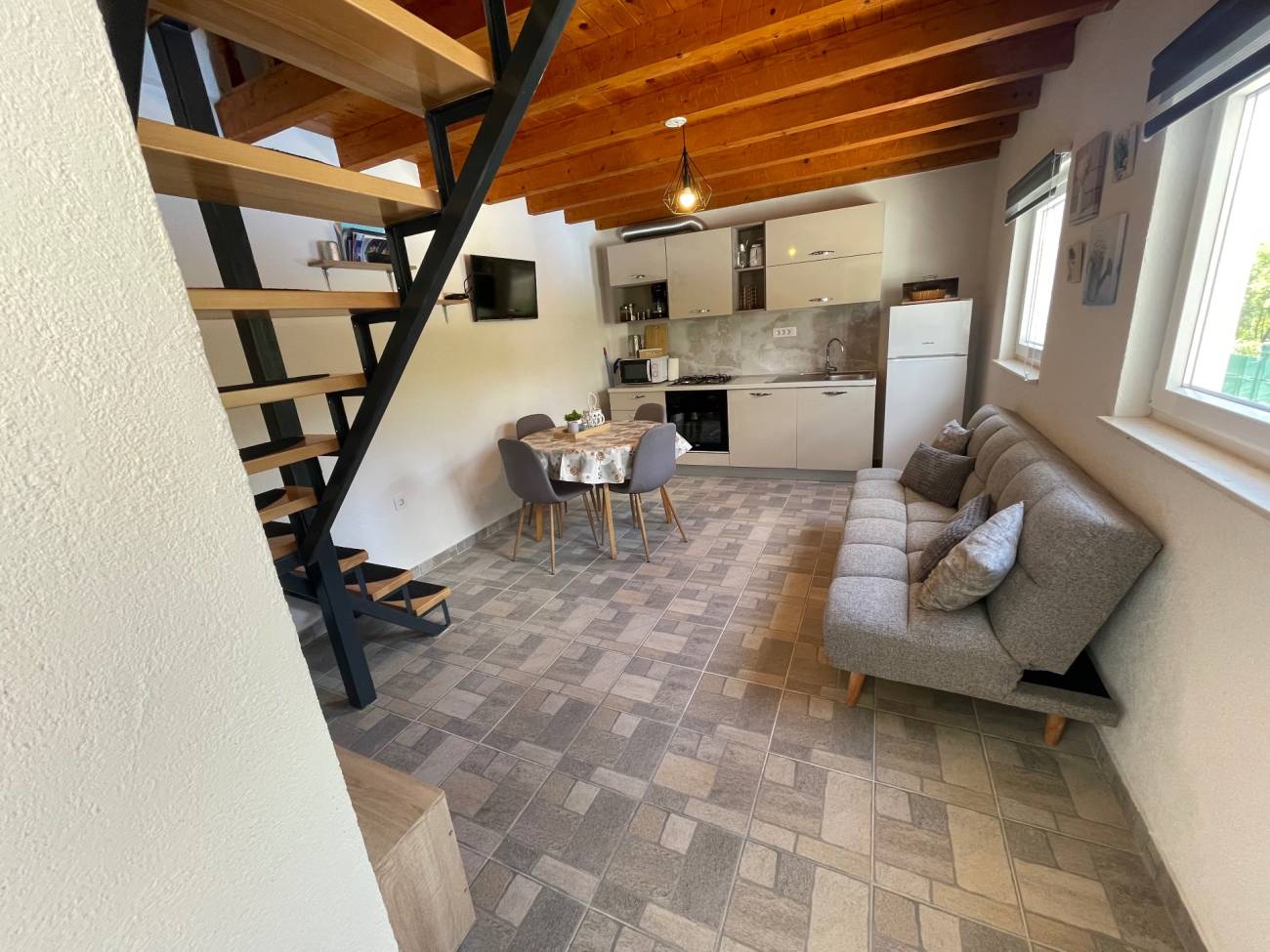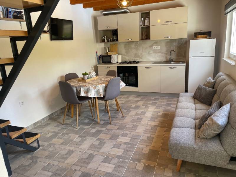 Unutrašnjost vile pažljivo je osmišljena – u prizemlju se nalazi moderna i potpuno opremljena kuhinja spojena s udobnim dnevnim boravkom, kupaonica te odvojena spavaća soba s vlastitom kupaonicom. Elegantna galerija na katu dodatno obogaćuje prostor i doprinosi jedinstvenom ugođaju vile.