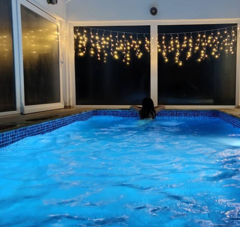 Sastoji se od unutarnjeg bazena, saune, 2 dnevna boravka, 2 kupatila, kuhinje, blagavaone i 3 spavaće sobe. Vani je sjenica sa roštiljem. Kuća ima popločano dvorište i besplatni parking te veliki vrt za opuštanje, šetnju, igru...