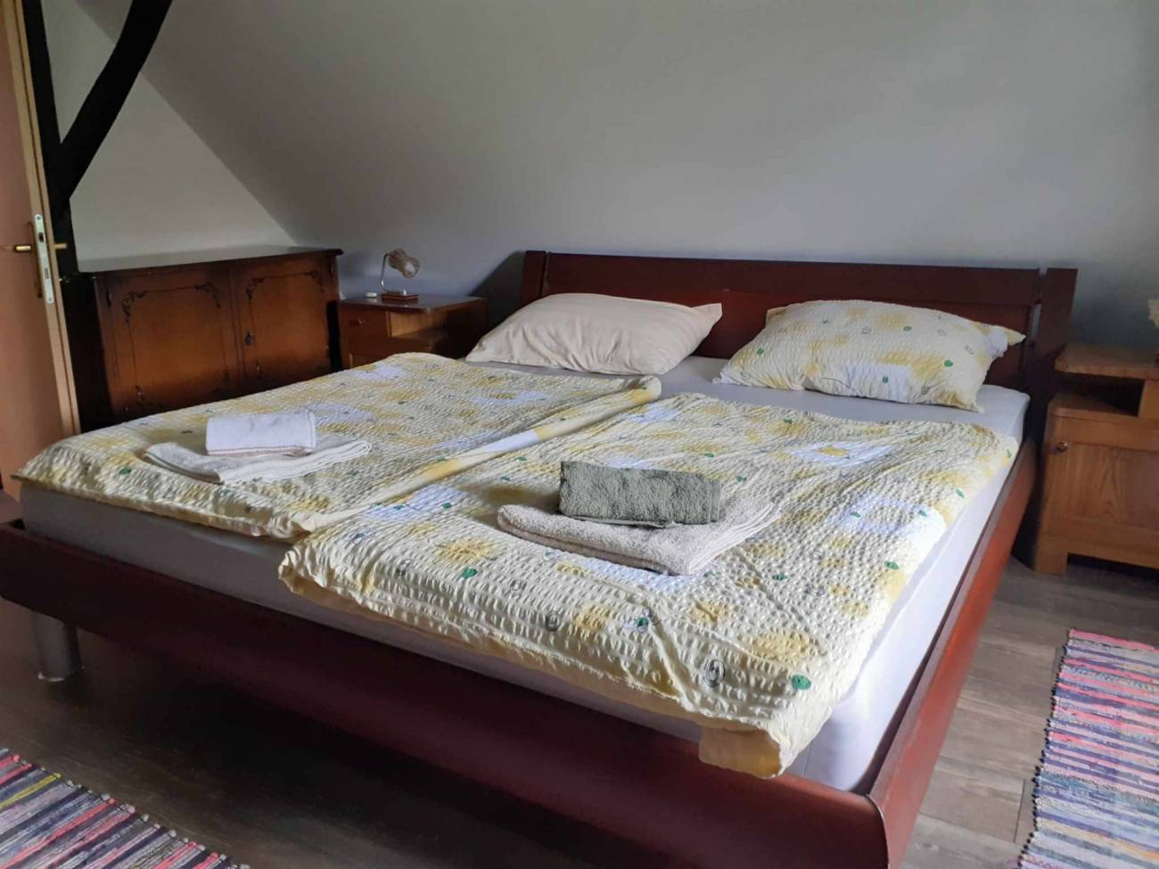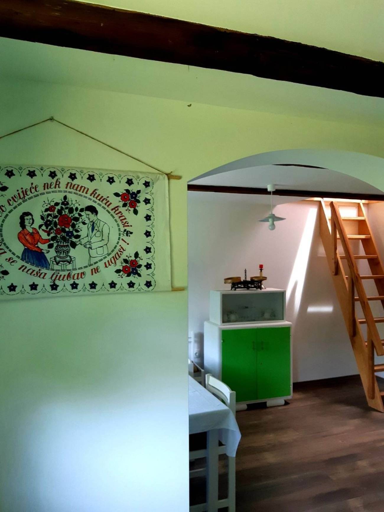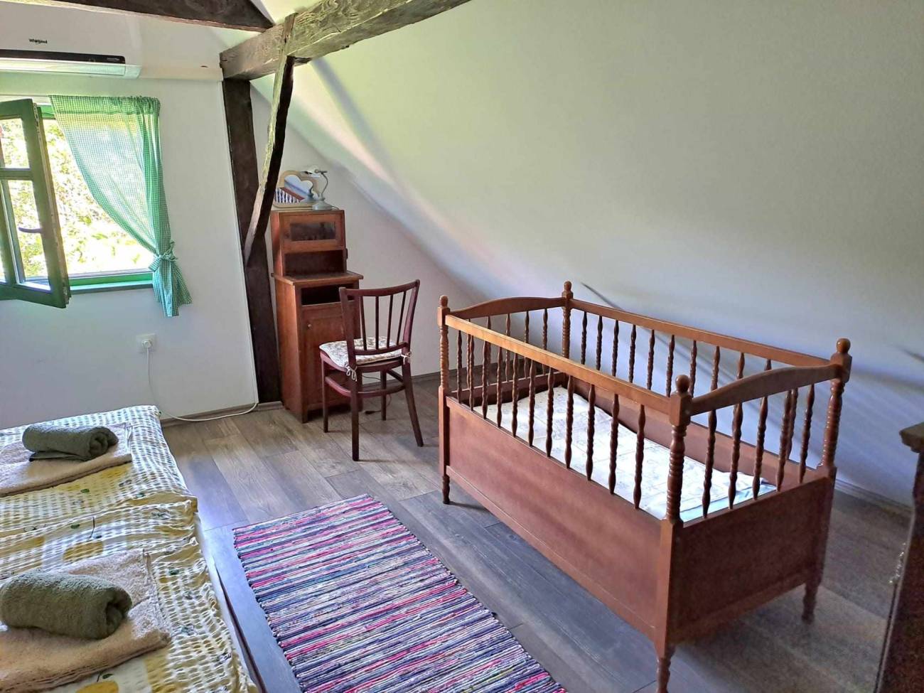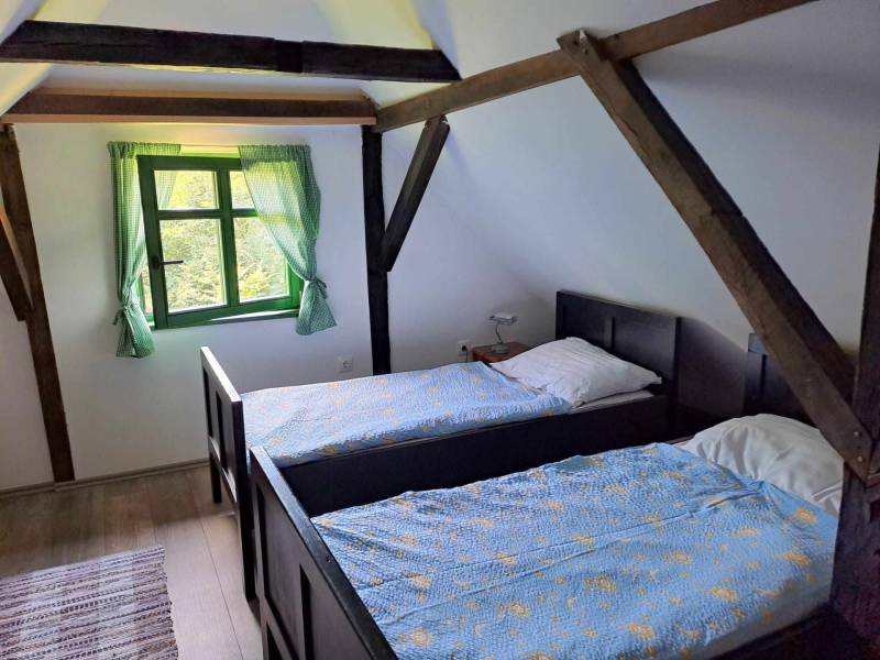 Na katu, odnosno tavanskom prostoru, nalaze se dvije spavaće sobe pri čemu je jedna opremljena bračnim krevetom i kinderbetom, a druga s tri kreveta. Također se na katu nalazi etno kutak u kojem su izloženi autohtoni starinski predmeti.
