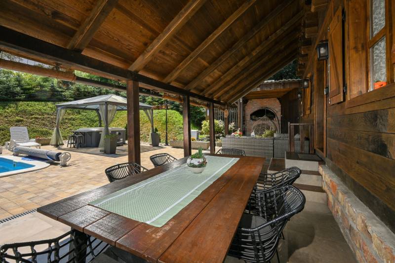 U zagrljaju prirode, odmorite tijelo u grijanom bazenu ili u hidromasažnoj kadi. Povežite se s djecom ili prijateljima te zajedno ispecite roštilj, igrajte društvene igre ili one koje su dostupne u kući, izbora je mnogo. A kuća, napravljena od drva, pravi je primjer njegovanja tradicije zagorskog doma. Vjerna je replika koja odiše prošlim vremenima, kroz čije prozore zrake sunca najavljuju početak novog dana i ispunjavaju unutrašnjost kuće, opremljene sa svim sadržajima prilagođenima modernom gostu. Osjetite baštinu, ali i toplinu ognjišta dok u hladnijim danima sjedite okupljeni oko kamina i pričate jedni s drugima.